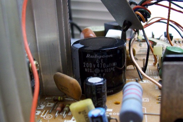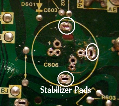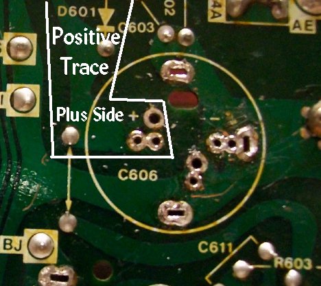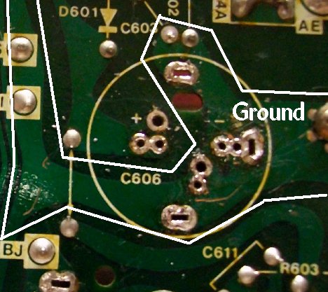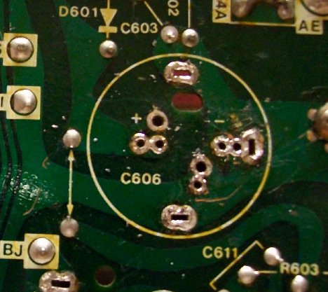 | Changing out B+ filter caps seems to give lots of folks trouble when it really shouldn't. I believe the first one to draw a lot of email was the G05 802 deflection board caps C100 & C101 which would apply to the WG V2000, as well. That was closely followed by the B+ filter used on the G07 chassis. B+ filter replacements on many other monitors drew emails to a lesser extent, but pointing to the G07 guided those to fruition. The current one is the subject of this page... the Sanyo 20EZ B+ filter. The one question that seems to preceed installation is the voltage rating. The OEM is a 470uf160v & we ship 470uf200v snap-in caps as replacements. The voltage rating of a cap is how much voltage that the cap can safely handle. With the OEM cap it should be able to handle an applied voltage around 160 volts & exceeding that voltage will turn the cap into a cherry bomb. The 200v caps we ship only serve to increase that safety margin. The voltage rating a cap can withstand in a circuit is only limited by it's physical size. If your PCB only has a one inch plot for mounting the cap then you obviously cannot mount a two inch in diameter cap rated at 500 volts, but if that 500 volt cap will fit in the designated area & has the proper microfarads your good to go. BTW: Ops never let the fact that the cap was too physically large to be mounted... just remembering the one I found in the bottom of a cab hanging by a lamp cord connected to the PCB :-() After getting the voltage issue behind & moving on, the next question is always about fitting the mounting holes.... it doesn't line up... the holes are too small... the holes are too close... the holes are too far apart & etc. Most chassis' will accomodate any cap layout via multiple silked positions. Unused holes will be solder filled & only need to be cleared if they are the ones you need for your particular cap. K... here's the C606 B+ filter mounting pads completely cleared out & you can see that there should be a pair of mounting holes for any cap type or size you can imagine. The ground trace is outlined above & it's easy to see that finding a hole won't be hard. The same goes for your positive lead... if need be, you can clear all the holes to find the ideal pair for mounting. There are even stabilizer pads to use a can-type cap & as you can see, they are all a part of the ground trace, as well, and could be used as a ground pad for your new cap, also. Here are the holes you need for our cap & it is good practice to backfill any unused holes with fresh solder. And... the coup de grāce... finished result! Happy Gaming... |