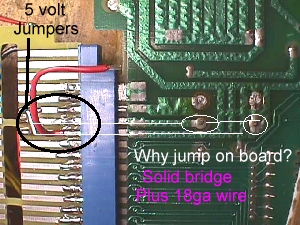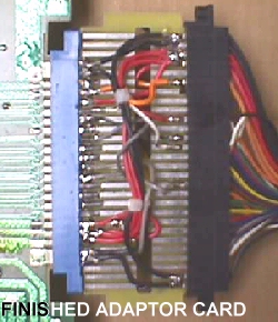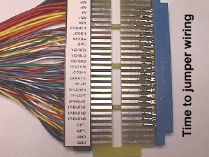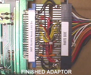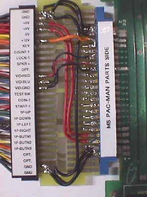 In the 1970s & early 1980s we had no vid game system in place such as the JAMMA system of today, so our test jigs were very basic with each portion terminating to a specific plug, i.e., a 15 pos Molex connector for input to control panel, a 9 pos for video input, dual 6 pos Molex for power output & a 2 pos for the speaker...the reason for breakdown was to utilize, e.g., the speaker for testing an amp, without needing to use another 15 position plug for only 2 wires. You can see where this is going, each game pcb that came into the shop, had to have a hard wire configuration made up from whatever I/O connectors that that specific game had, to the test jig Molex I/O. Needless to say 4' wiring harnesses were piling up as each different pcb came in to be tested or worked on. Now along comes Konami with a system that our first 18/36 harness built would work with many boards & they kept coming...more & more...WOW a unified system. Let's run with it. Now we have to make adaptors from game X, Y & Z as they come in to adapt to a Konami harness & we can use adaptor cards. Can it get any better? Well, of course it could, and Konami..the innovator of the concept..had to join ranks with the others to satisfy larger I/O needs and bigger & better vid games in this new fangled system called JAMMA. Umph! Now we need to go with JAMMA adaptors & hook up a JAMMA harness to every jig in the shop. Well I started by having the adaptor card fingerboards made right here in New Orleans where everything cost a fortune, and by the end of 1986 most all the old commonly used harnesses had been adapted to this new system. The first design....similar to the ones I use now from Andy's House of Adaptors....was off by a bit, since I only made provisions for up to a 22/44 pos edge connector on the adapted side :( Who knew that mfgers would see this 28/56 connector as an opportunity to start making up their own pinouts to it...jeez...now I needed 28/56 to 28/56 & they wanted my first born child and the next ten years profits to make up the fingerboards for me. My first reaction was to say, "excuse me, but I don't want them already prewired" to which I was given a song & dance about the cost of design going up & etc..etc. Enter my savior...John Robertson of John's Jukes had already gotten some made up & they would save me $2 on each one at $10 each at that time. Well, the adaptors continued to be made for each game that was to go on location that was not JAMMA. Many a Ms Pac-Man & Galaga were adapted to 25" JAMMA cabs & put on location. 1999 & now collectors & just plain game players want to adapt games to JAMMA cabs and Ms Pac-Man seems to be one of the big stumbling blocks that was overcome back around mid 1986 and without all this damage & hacking to the pcbs. An op could take his Pac series pcb with him & put it in a dedicated game or a JAMMA cab & have it work equally well with only sometimes having to turn the +5 volts up a tad...and they marked one that had to go up, so that when the next route collector went to change the pcb, he knew to turn the voltage down. This was not very often, and we were using 7 amp switching power supplies at the onset...today there is no need to set the 5 volts high with these 15 amp power supplies. I've tried to explain this to several people, but they can't get by the theory factor, which I threw out over 40 years ago when I got my first job working for a distributor. They said if you want to continue working here, you're going to have to get all those college ideas out of your head and start from scratch in the real world. I did & have owned my own businesses for 40 years now, so they were right. Now I have this Sony digital camera to take pic's as I go, so that it is seen, as well as read. Here's how to make an adaptor for Pac series. BTW: In electronics, it is adaptor rather than adapter which might apply to a plumber's trade or others, although I guess it really doesn't matter, since anyone in electronics is going to know what you are talking about.