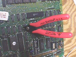 From the Dollar Store Tools You'll Need: You'll need the HT-1921 crimping tool or a compatible crimper, not a $2 or $3 automotive crimper that is fine for most fully insulated quick disconnects, but does not have the saddles to do small pins & sockets. You'll need a split pin extractor or any of the common simple items I have listed on the Crimp Mystery Page and, of course, a flushcutter of some kind. Getting Started: The first thing to do is replace the 2 resistors at R29 & R30 being sure to clean up the PCB, if charred, under them before installing the new ones. Next pull your 22/44 edge connector from the game PCB. At this point it would be a good idea to use a magnifying glass to check for the word "Molex" on the end of the black housing to be sure that it has not been previously changed out with an off-brand connector. Now that you know you have the Molex you can use that magnifying glass to locate the position numbers on the housing.... noting that all numerals are on the insertion side (wire side)... and find positions 1/A/2/B & 21/22. These are the pins that you'll need to shotgun & the foolproof way is to remove one wire at a time, cut the old pin off about a 1/4" back giving you a good clean wire to attach a new pin to & then replace it in the same position on the housing. Do them all like that & it'll squash the error margin. You should be good to go at this point, but you should clean the edge fingers on the PCB with an eraser before replacing the 22/44 edge connector. There are a couple caveats... one being that if you do not do a good job in crimping, keeping a tight, rounded crimp it may not fit into the housing slot. If this happens you can use the crimper again to reshape allowing entry. You want your finish crimp to look as close as possible to the old one that you clipped off. A fair to good job will fall right into the slot easily. Also, when using an eraser be sure that all residue is brushed or blown away from the board & connector.... rubber is an insulator! If you have more than one A/R board in your game, such as Pole Position, you may need to double up on the split pin purchase as it will take a few more. The Pole Position second board's 15/30 connector will need these positions shotgunned... 1/A/2/B & 14/15. Happy Gaming... |