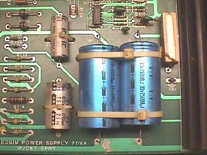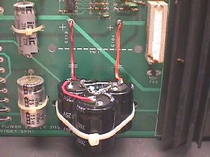 I have several different methods of changing out the older axial capacitors posted in various places onsite, but here's another method of using them on an A082-90421-xxxx Midway medium power supply board done in the wee hours of the morning to keep a promise to John V.