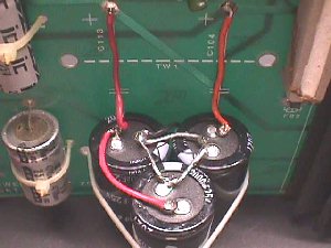 The actual setup I'm doing is a not-so-pretty configuration, but it shows the basic principles involved electrically. Once you grasp that concept you can see how you could arrange the new caps many different ways on the board so long as you wire them them up correctly. K... let's change out this 40K & 25K axials using three new fresh 22K radials. The first step was to set the three in a triangular configuration on the bench with all the ground legs facing the center. Then a piece of black 18ga wire approximately 12" long was stripped & tinned on one end about 3 inches. Starting at any one of the 3 ground legs it can be soldered on in the same triangular configuration tying all three together to serve as a ground terminal for all while stabilizing the stack on one end. Now the stack can be placed on the board & fastened in place with a 12" cable tie making sure that the insulated part of the new ground terminal wire is placed at the bottom where it can be soldered to either one of the 2 ground tie points left after removing the originals. Next step is to tie in the positive legs. The one on the left was a single 40K so a piece of red 18ga wire was soldered onto the top capacitor + terminal & then looped to the lower cap + terminal & finally over to the + tie point on the board. This combines the 2 capacitors in parallel to form a new 44K filter cap. On the right you simply have to tie the remaining cap's + terminal to the + tie point on the board's right side to tie in a 22K fresh replacement which is more than adequate to replace the existing 25K. You can add hot glue to stabilize if needed, or desired, and as I said in the beginning, as long as you maintain the electrical circuit you can place these caps in a number of other arrangements & they wouldn't necessarily have to be stacked, e.g., the 2 combined ones could lay flat to the bd where they are now, while the single cap could be placed above it flat to the board. There is no limit to the ways this can be accomplished as long as the electrical integrity is not compromised. Caps can be hot glued on end any place on the bd where there is room for them & wires run to the appropriate tie points on the bd... which do not necessarily have to be where the old ones were since you can follow along the bd trace to a more convenient spot to tie into. For that matter, you are not restricted to using the board at all. If you find there is no room for a replacement cap you can mount it remotely... bottom of the cab...side...if ugly is your thing you can mount it on top of the cab if you want, so long as you run wires to their respective tie points on the PCB they will still function the same. Happy Gaming... |