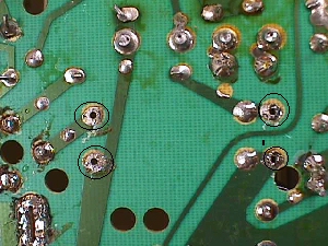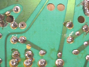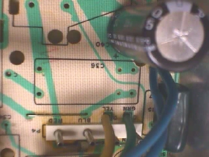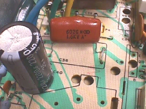 ![]() These are found in early versions of the K7000, later versions replaced these with standard two legged radials, but PCB traces were also modified to accommodate. You'll have to do your own modifying to replace these with the common type, as the old chassis depended on this cap to complete the HOT's path to ground & flyback winding. ![]() The two legs on each end of the old capacitor should measure a dead short to each other as they are electrically the same point & as you can see in the outlined block above for C36 (upside down), the two end legs are actually needed to complete the circuit on the PCB. ![]() Above is the solder side of the board after removing the cap. The first thing to do would be to connect the circuits back together. As I've said in other docs on the Help Page, I always saved the clippings from cap replacement, resistors & other components to use for jumpers in situations like this. Easy & cheap :-) ![]() Rather than square the ends of the jumper to 90º, I prefer to leave them arched & this case is a good example of why I do that. It leaves a nice tie point, whether it be for a scope lead clip while you are working on the chassis or for mods like this one. ![]() After soldering in the jumpers you need to remove the solder in one of the two parallel dead (unused) thru-holes next to the jumper on the left above. Flip the chassis over and make a hook with one lead of your replacement cap. Hook it up under the jumper closest to the HOT & guide the other end through the hole you opened up & solder this end in from the underside. ![]() Now you can finish the hook end by closing the hook around the jumper, aligning it to suit your taste & then soldering it to the jumper. Once cooled... ball the joint with solder to hide any pointy place that may lend itself to arcing. If you've missed balling in the Help Pages elsewhere, it is just melting/melding a round ball of solder onto the finished joint to encase it. Happy Gaming.... |
