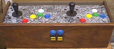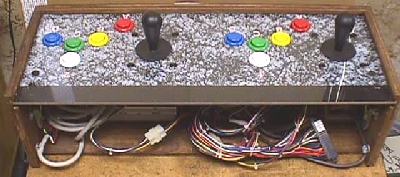 Under the 2 blue buttons mounted on the front are the test & coin up buttons, which are both illuminated to allow the tech to know that the jig is on & hot. Simply unlatching & unplugging the 1 & 2 player harnesses from the CP allows for it's complete removal as pic'd below. In the cabs, this made it very easy for an op to change a game on location in a couple of minutes. Plug up the new JAMMA, or JAMMA adapted board, change the CP to correspond & lock it up, moving on to the next location, which might very well receive the PCB & CP just removed from this cab.