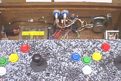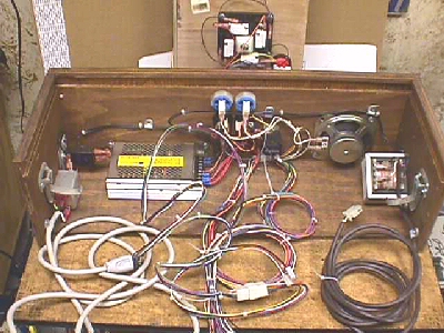 Now, right in the center, the end of the JAMMA harness is cable clamped to the bottom & DC power lines run to the switching PS. The CP lines are terminated in player 1 & player 2 receptacles ready to plug in any game CP. Eight to ten inches from the JAMMA edge connector, the video lines are pulled out an terminated in a Molex receptacle allowing for an extension cable to be added to give the video lines about 7 or 8 feet total length to be added to the length of the JAMMA harness, making any monitor easily accessible. At this point, a bullet connector is added across the HS & VS at the Molex extension plug to be capable of shorting the two lines together for any composite sync pcbs that may be connected to it. On the older pcbs with both syncs needed, the bullet only need be unplugged. I suppose a switch could have been used for this, but bullet connectors are much cheaper :)