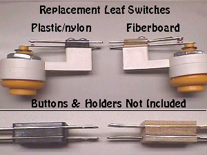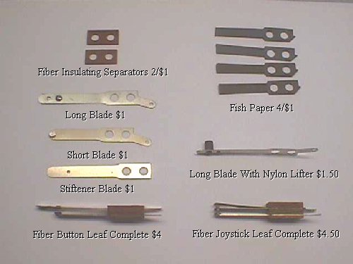 Fiber leaf switches have been around for many years & are much better than the molded versions of the Nylon era in MHO. I was working with them 50 years ago on electromechanical equipment that was nearly 20 years old at the time, so I guess it's safe to say they have been around nearly a century now. The blades are much stronger than those used with the nylon ones & should one break, or wear out, it can be replaced, unlike the disposable nylon type. Since the nylon type for buttons & joysticks have been becoming extinct, we've been making up replacements in fiber. So far, 140 of y'all have agreed with me that fiber is a much better replacement by far... be it for buttons or, especially with the old Wico leaf joysticks. The biggest problem with both fiber & nylon molded leaf switches comes from user abuse. They are gold flashed for the best contact & the gold flash blackens. This can build up over time & cause intermittent closing of the contacts. Then the user grabs a file or sandpaper & tries to clean them which in turn removes the gold flashing rendering them less than effective. The best method of cleaning for longevity is a simple business card or business card stock of any kind. On location they were often times cleaned with the card stock from a candy bar wrapper or a match book cover. It is only necessary to clean the very center where actual contact between the two blades is made... the outer parts can be left blackened without any detrimental effects. Above are both styles of joystick leaf switches. This type used on joysticks comprises 2 of the shorter blades of the same length, whereas the button leaf switch has one short blade & one long blade which extends out to be depressed by the actual button when pushed. I haven't had a chance to add the repair parts to the Parts Page yet, but I'll price them below in a pic. The blade thickness on these is .020 which is x-heavy. These were typically listed as follows: