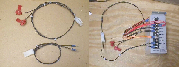 Pair up like colors that best match in length on the unterminated ends of the wire bundle. You should have 4 pair of the same length & one pair of red wires that are a little longer. If any pair ends up with one of the wires being a quarter inch, or so, longer than it's mate, just snip off the excess to make them equal.... not that critical. Strip back each pair of wires about a quarter inch, twist them together & crimp on a spade connector. It should look like the pic below at this point & the adaptor portion is ready to use :-)Do a final solder splash scan to be on the safe side.