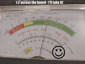 K... I got all the junk out & did a visual inspection of all the connectors & wiring & everything was there & didn't *look* too bad, so I grabbed a new power cord to see what I had... a bit antsy after a 7 year hiatus from the repair scene, but I was hoping to get lucky. Did I? Did you win the lottery this week :-) It roared on alright... that deafing hum that tells you that it's time for a new fuse block & edge connector, but I waited for a sign of pic tube life & when it didn't emerge I hit the coin trip switch. Ah... sound.... game works... ugh! A G07 monitor, but that flyback looked real strong & I can see the warm glow of the CRT filament, so it's time for a quick check of the tube by killing the shop lights. Ah... there's Ms Pac running around in the dark. Turning up the screen control washes out what little pic is visible. This is not good... all colors so low that you need the lights out to see anything even with no gray plexi in place. It's time to get the CRT tester/rejuvinator out & dust it off.