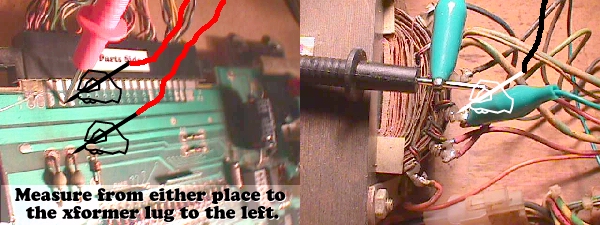 Onward with the repairs... the quad fuse block & new real Molex edge connector need to be installed next, but lots of you ask how you can test to be sure that you need this done. If it's OEM, it needs to be done, but if you want to see anyway, all you need is an ohmmeter to check the continuity of the wiring from the time it leaves the xformer till after it enters the game board. In the pic above you can see that if you put one lead of the meter on the xformer's 3rd lug which has a green wire attached, and you put the other lead on the board's "D" pad, or the anode of A7 as shown, you are measuring the continuity of the green wire, through the 2 solder joints of the fuse holder, the fuse holder, the break plug just before the edge connector, through the edge connector & it's terminal (pin) right to it's destination, so if you get an infinite reading you know that leg is open somewhere along the the way. If you measure more than 1 or 2 ohms you know that circuit is in trouble. Here are my results below.