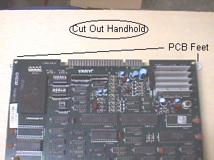 If you're one who spends as little as possible on a testing aid, saving every extra penny for that new game you've been wanting, you can simply cut a piece of cardboard the size of the PCB & cable tie it to the solder side to protect the PCB from shorting to anything when handling it. If this isn't for you, you can always mount the PCB on a piece of plywood & even cut out a handhold to tote it around by.