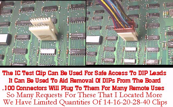 ![]() These IC test clips come in handy for dozens of uses & I'm going to toss out a few of them along with some pics. The first use is as it's name depicts... an IC test clip as pic'd above left. Clipped onto an IC that you want to take measurements on it facilitates access with probes from meters, scopes, logic probes, pulsers or other equipment & helps prevent shorting in those tight locations that PCB mfrs love to come up with. The pic above right shows how you can use wired .100 connectors as extensions for various uses. You can use these to your advantage since they slip on & off without damage to the IC test clip to suit your particular testing needs. You can make up cables with larger connectors than you really need, so that you can use them on any of the IC test clips up to 40 positions by just letting any unused positions hang over the end. You only need ensure that both connectors start with the pin 1 position. You can make permanent cables like this one which goes from a 40 pin dip header to a soldered in place 40 pin IC test clip. This was used in places such as the Z80 on a Pac bd that hides under a riser bd. After removing the Z80 & plugging in the dip header the test clip can be clipped to a Z80 on a dummy bd or even on a Ms Pac sat bd that has a cardboard backing on it. This one goes from a 40 pin header such as found on WMs games out to a 40 pin IC test clip via .100 connectors. Using a pair like above you can sub in a suspect IC from a dummy bd or I've had a few techs over the years that would drive me crazy by just letting the known good IC free hang from the clip. Using a dip header you can also extract information from soldered in eproms for your programmer. Another way to use these is to mount an IC socket on a dummy bd as pic'd above. You can add a ZIF socket to top it off for quick & easy changing of ICs. There are limitless ways you can use these as testing devices for specific jobs you need to accomplish. Throw in a handful of resistors & a handful of LEDs & you can have a visual of what is going on with an IC under test. |