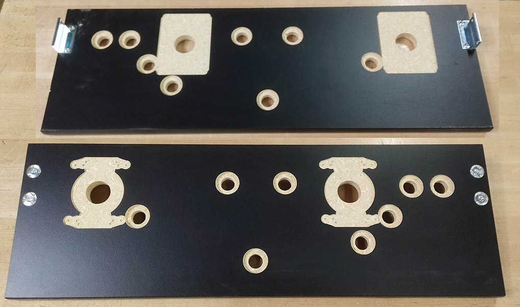 Metal plates (pair) for Joust wood control panels to allow recessed joystick dust covers. Includes 8 flat head screws (#8 x 5/8�).