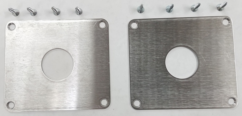 Metal plates (pair) for Robotron wood control panels to allow recessed joystick dust covers. Includes 8 flat head screws (#8 x 5/8�). |
